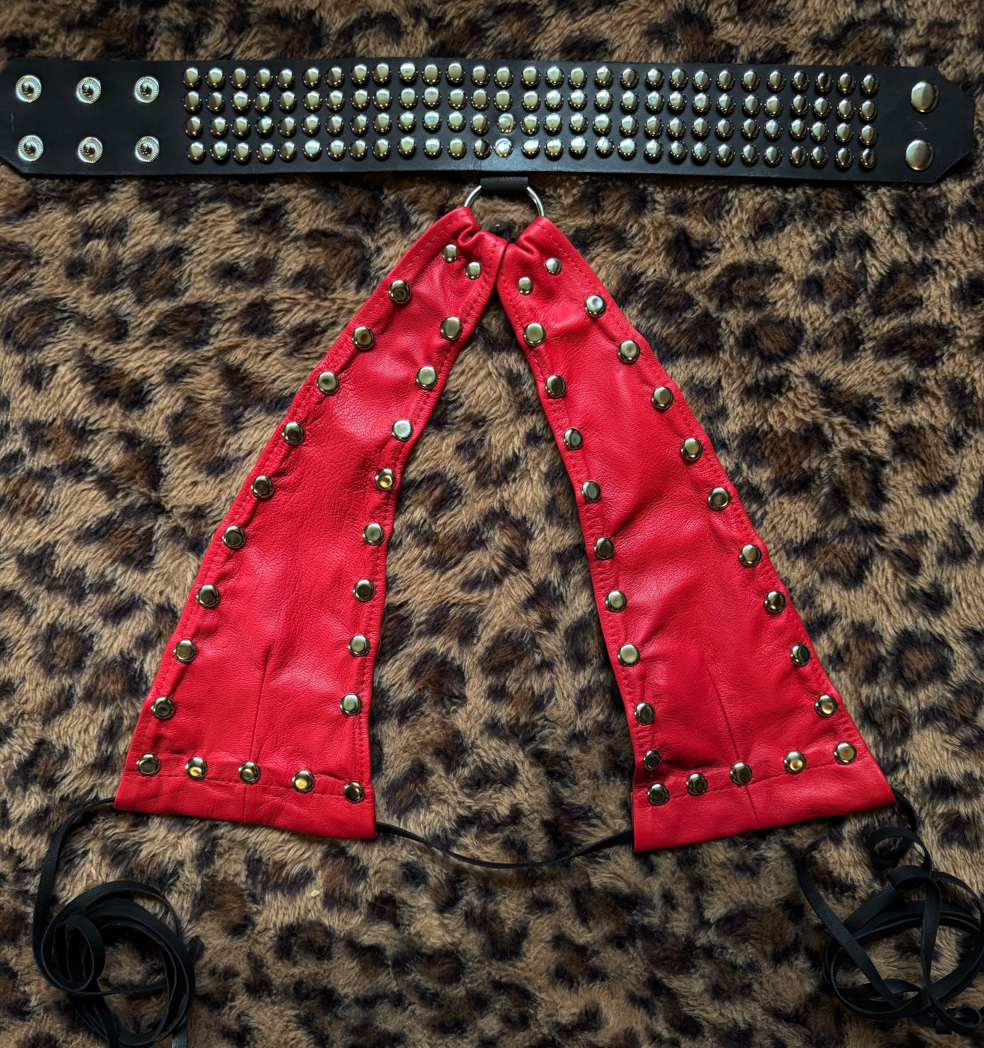 The Countess top is made with buttery soft red kid nappa leather, it has an adjustable snap closure heavy leather collar covered in rivets. Leather under-bust band is adjustable tying at the back. Studded with flat top studs.