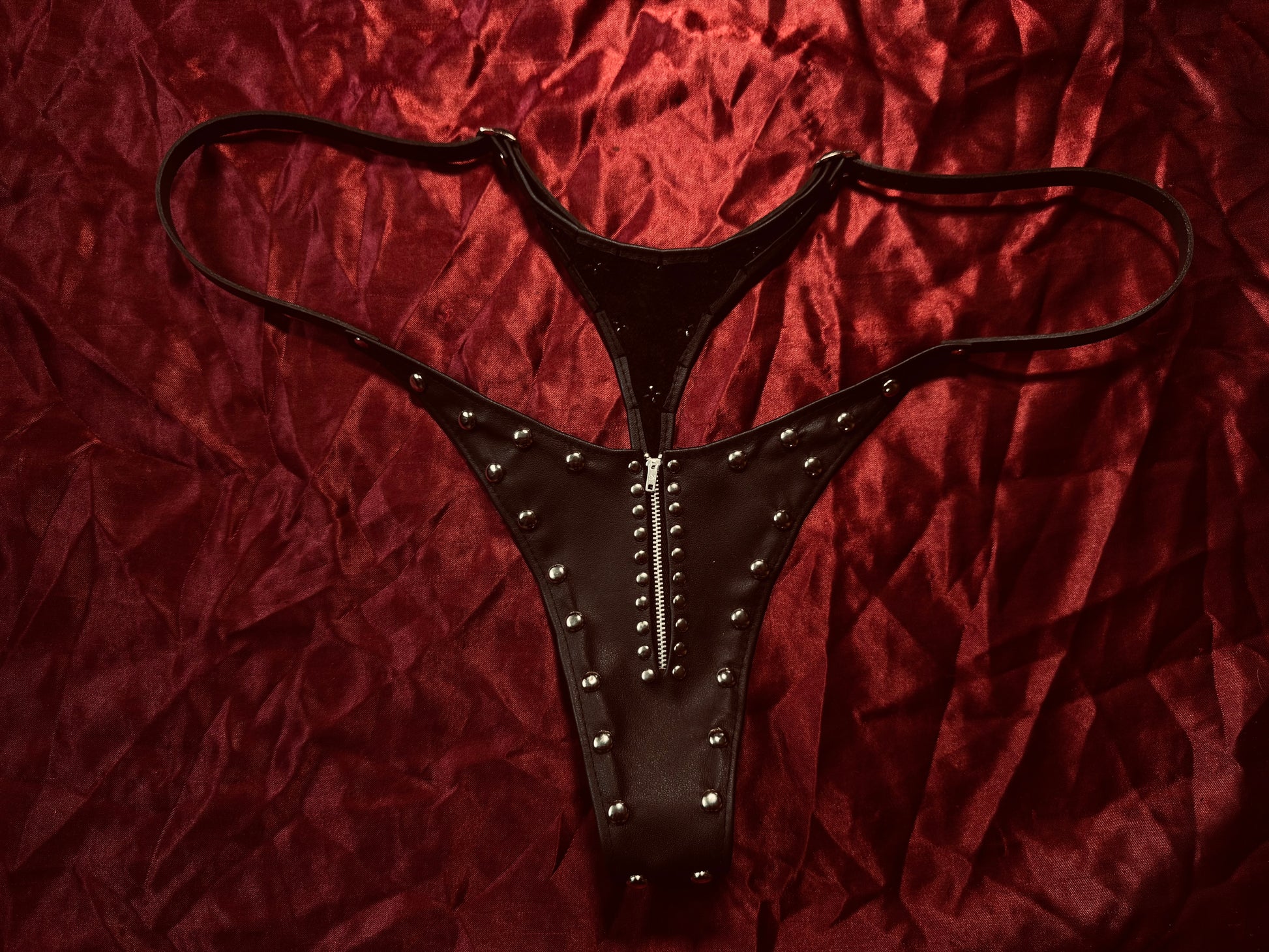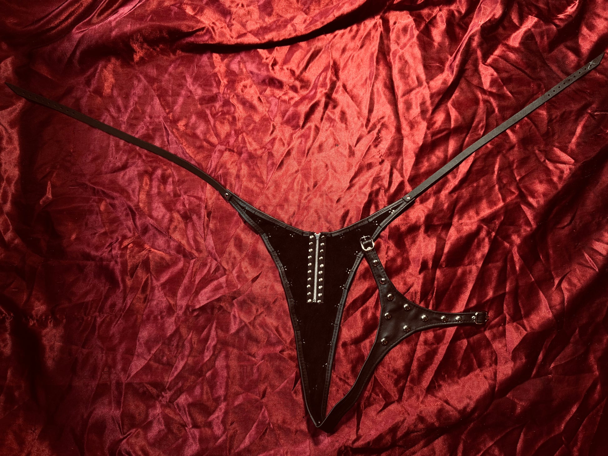 The Janine thong is made from black milano cowhide leather, with zip front detailing and adjustable buckle strap closure at the back. Topped off with silver dome studs.