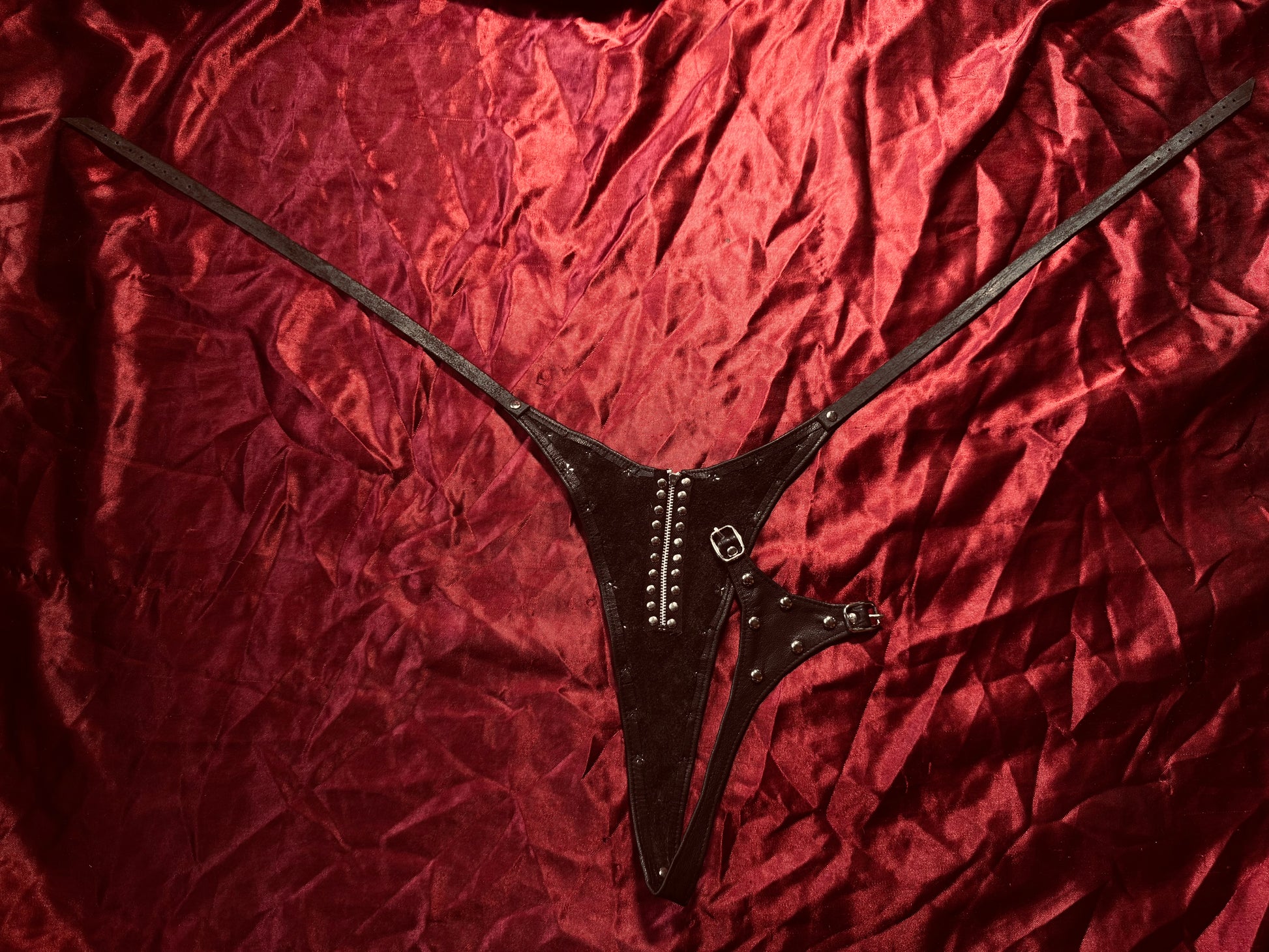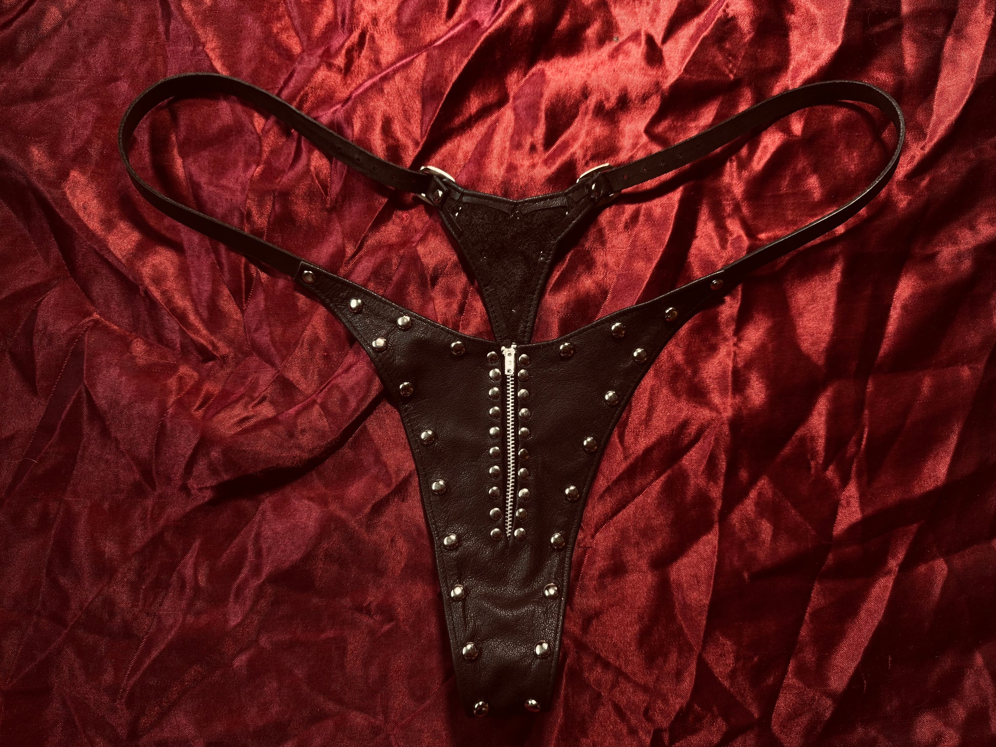 The Janine thong is made from black milano cowhide leather, with zip front detailing and adjustable buckle strap closure at the back. Topped off with silver dome studs.