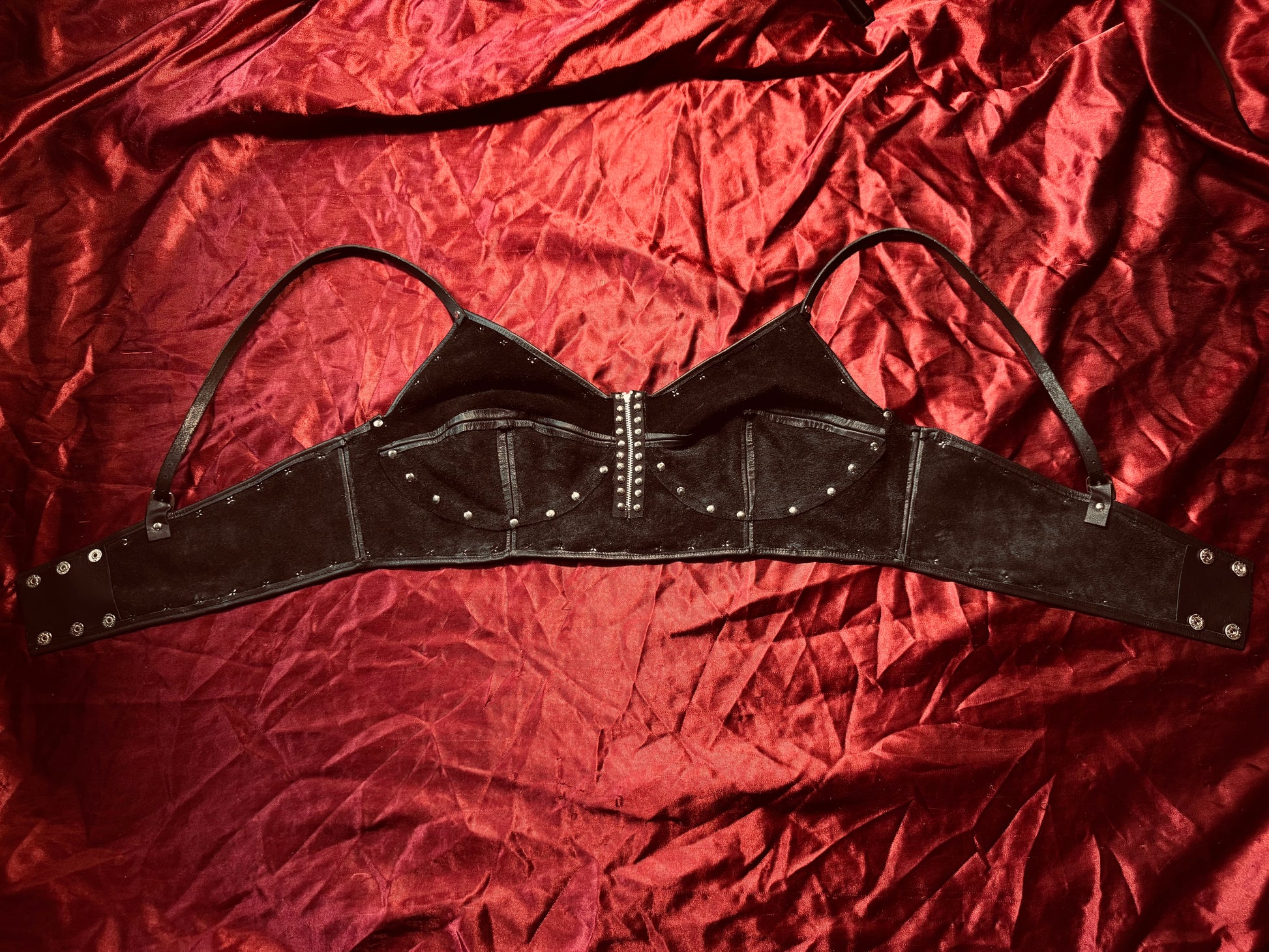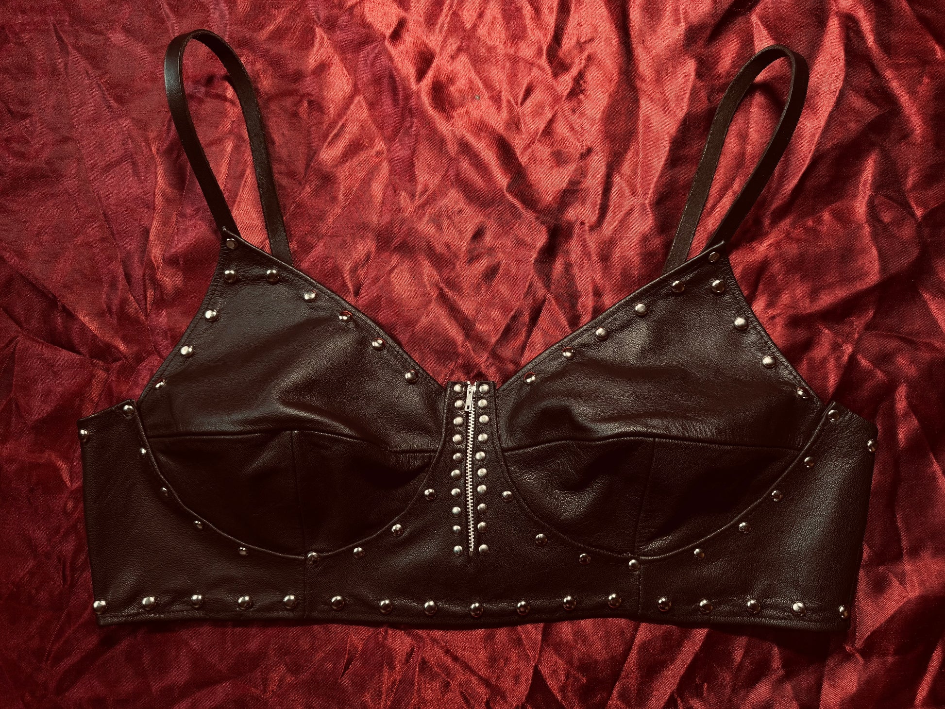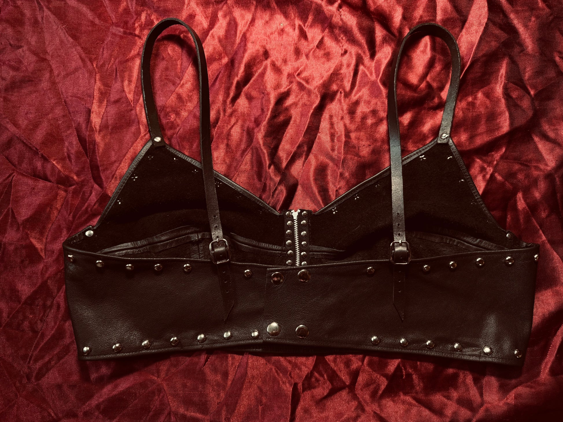 The Janine top is a full cup design made from black Milano cowhide leather with dome studs and zip front detailing. Snap rivets close at the back and adjustable shoulder straps buckle behind.