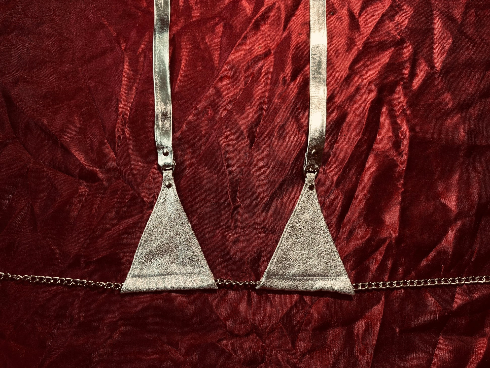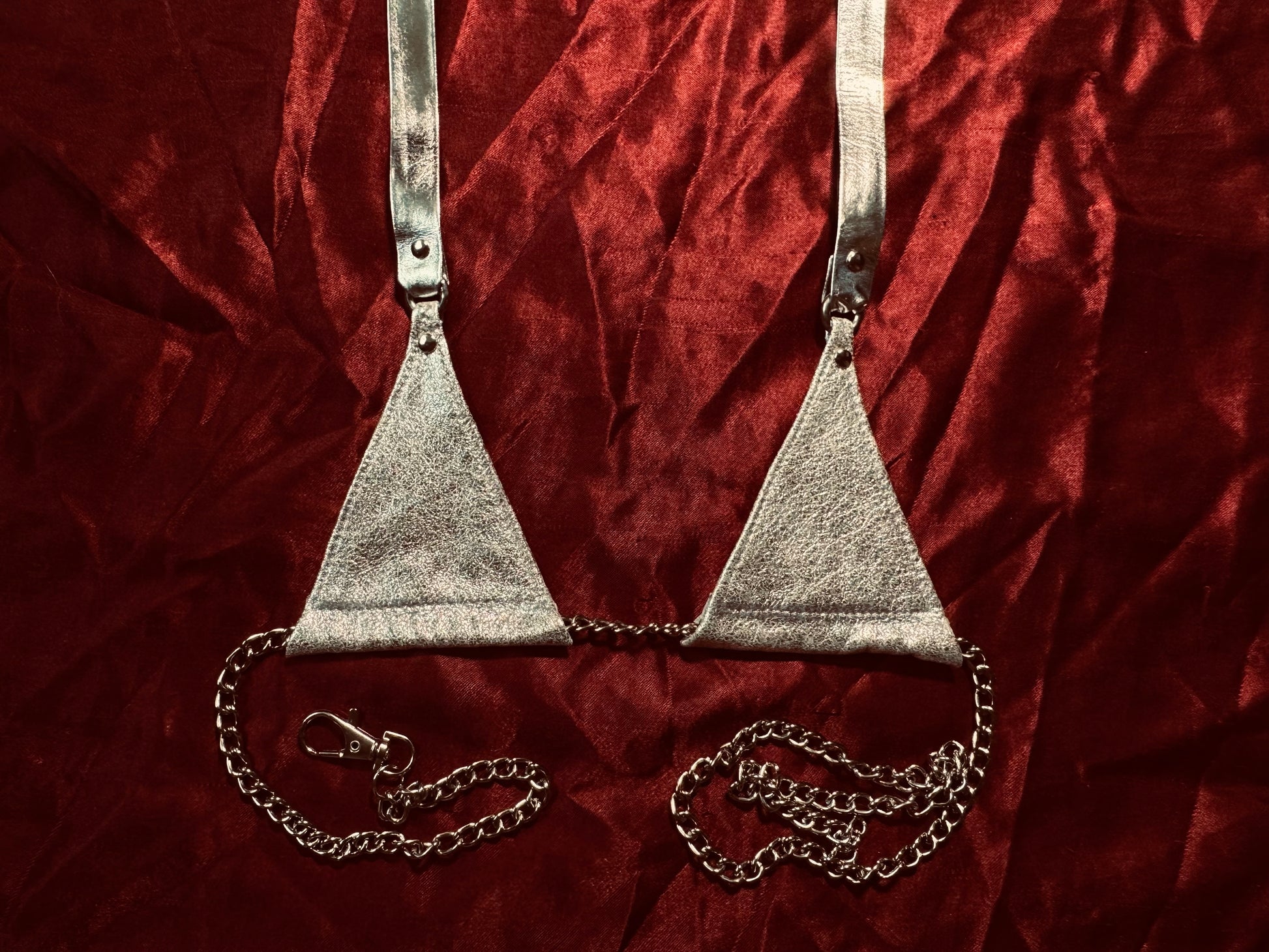 The Jenna microkini top is made with soft, thin, metallic silver leather. It has a chain and clasp under bust band & closure, and ties around the neck with metallic silver ribbon like straps.