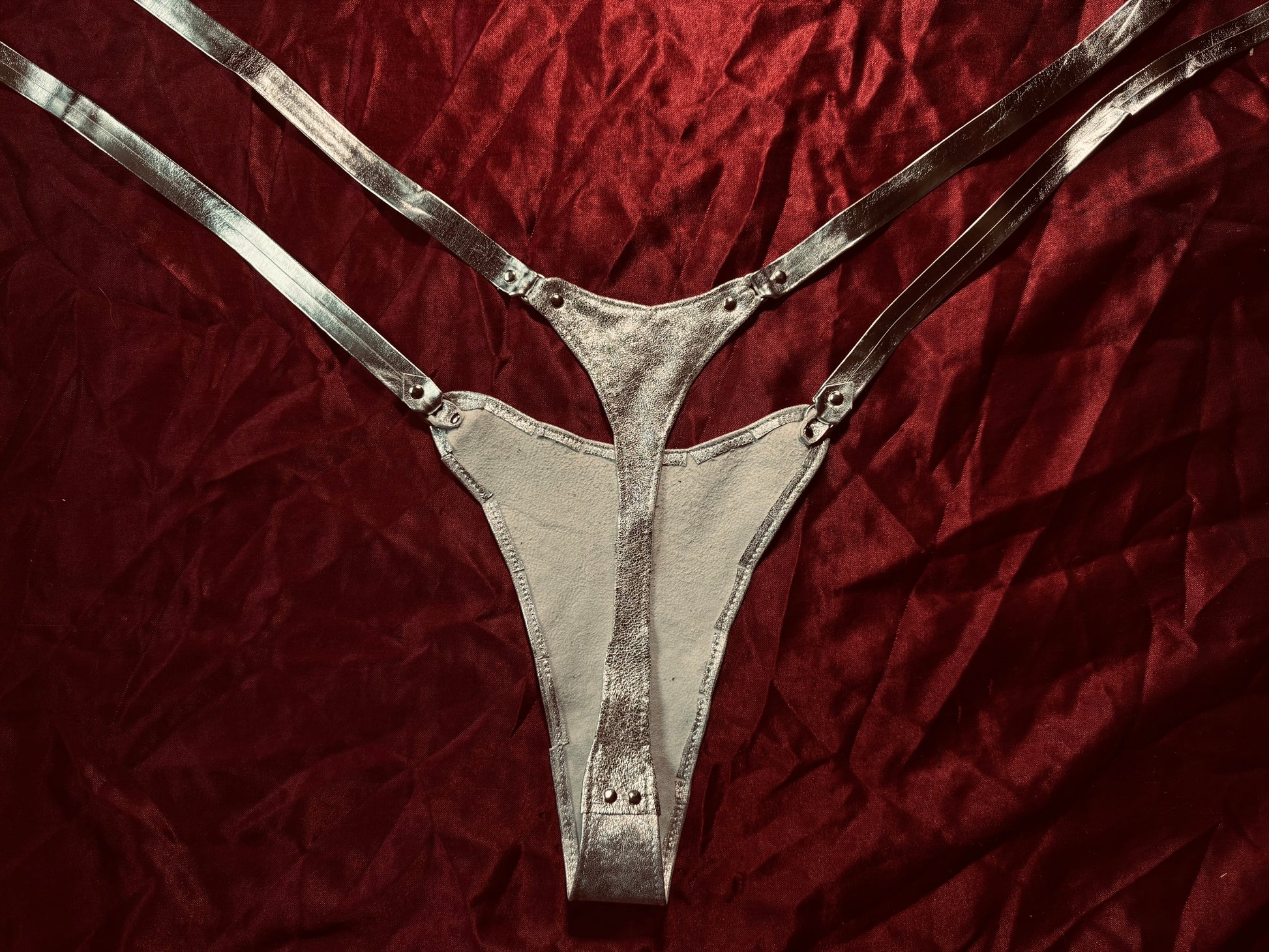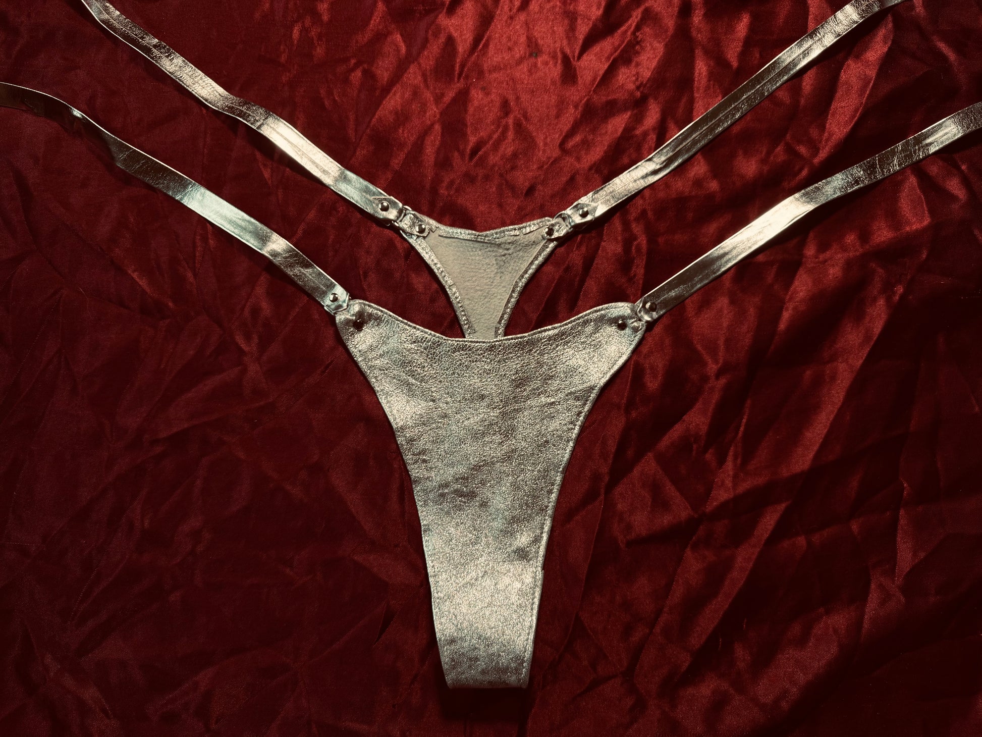 The Jenna thong is made with soft, thin, metallic silver leather and ties at the sides with metallic silver ribbon like straps.