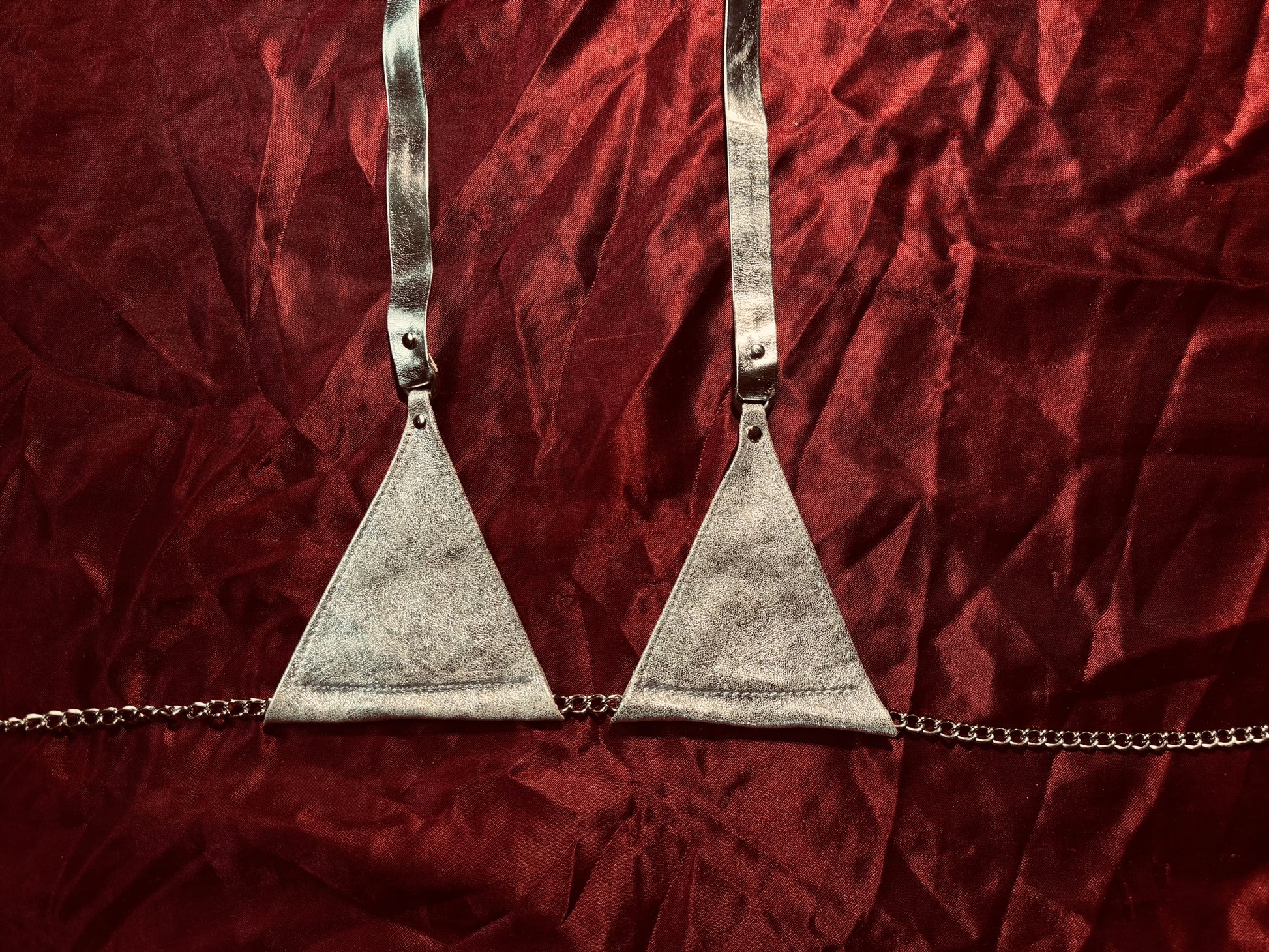 The Jenna microkini top is made with soft, thin, metallic silver leather. It has a chain and clasp under bust band & closure, and ties around the neck with metallic silver ribbon like straps.