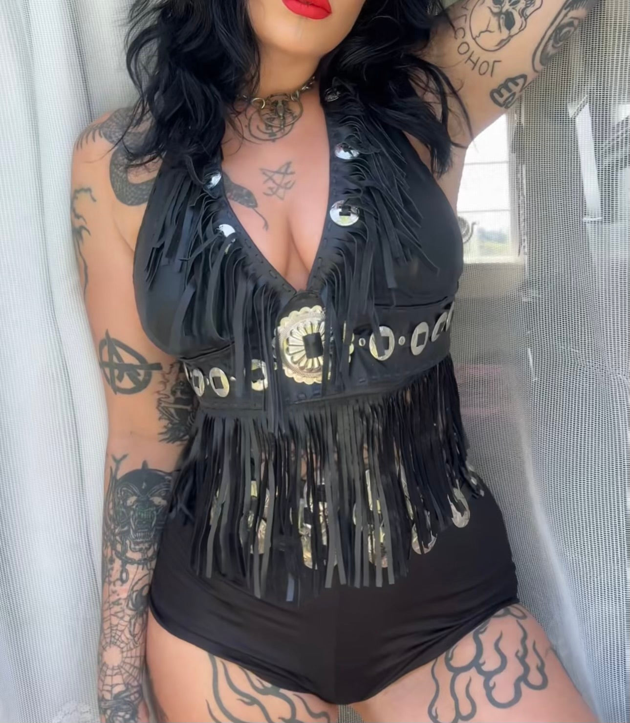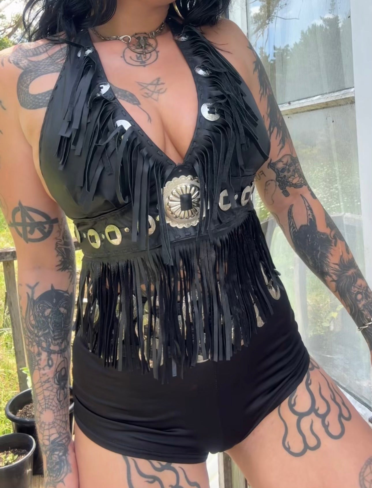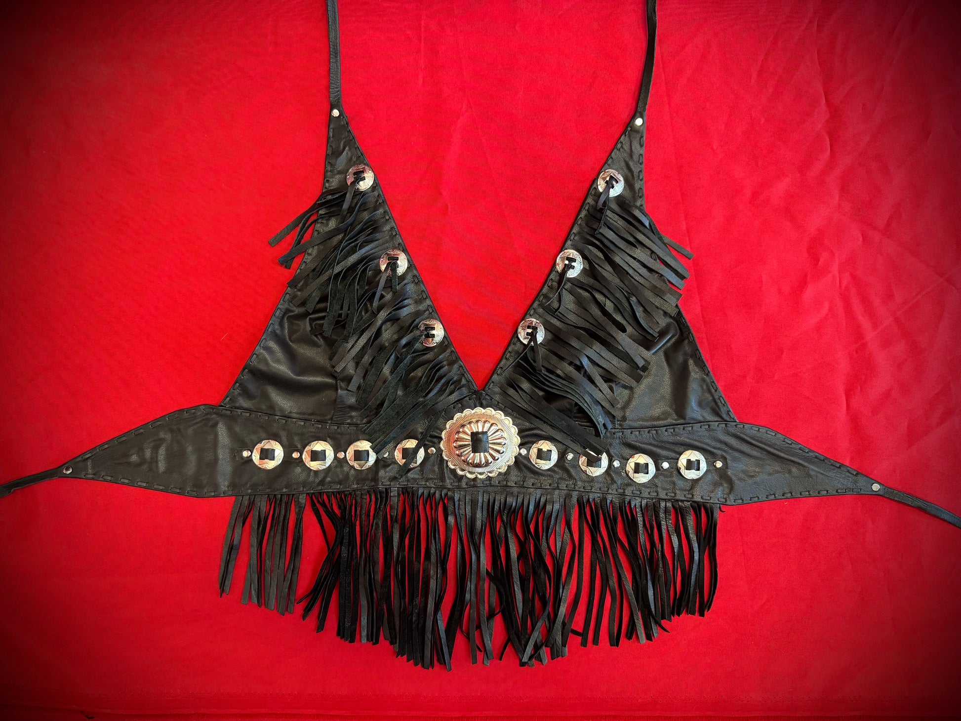 Inspired by a halter design I spied in a 70s easyrider magazine, we have the new ‘La Grange’ halter. Milano cow hide leather hand stitched with leather lacing , hand cut fringe and concho embellishments on each cup, plus a concho under bust belt band and more hand cut fringe along the bottom. Handmade leather straps tie up around the back and neck.