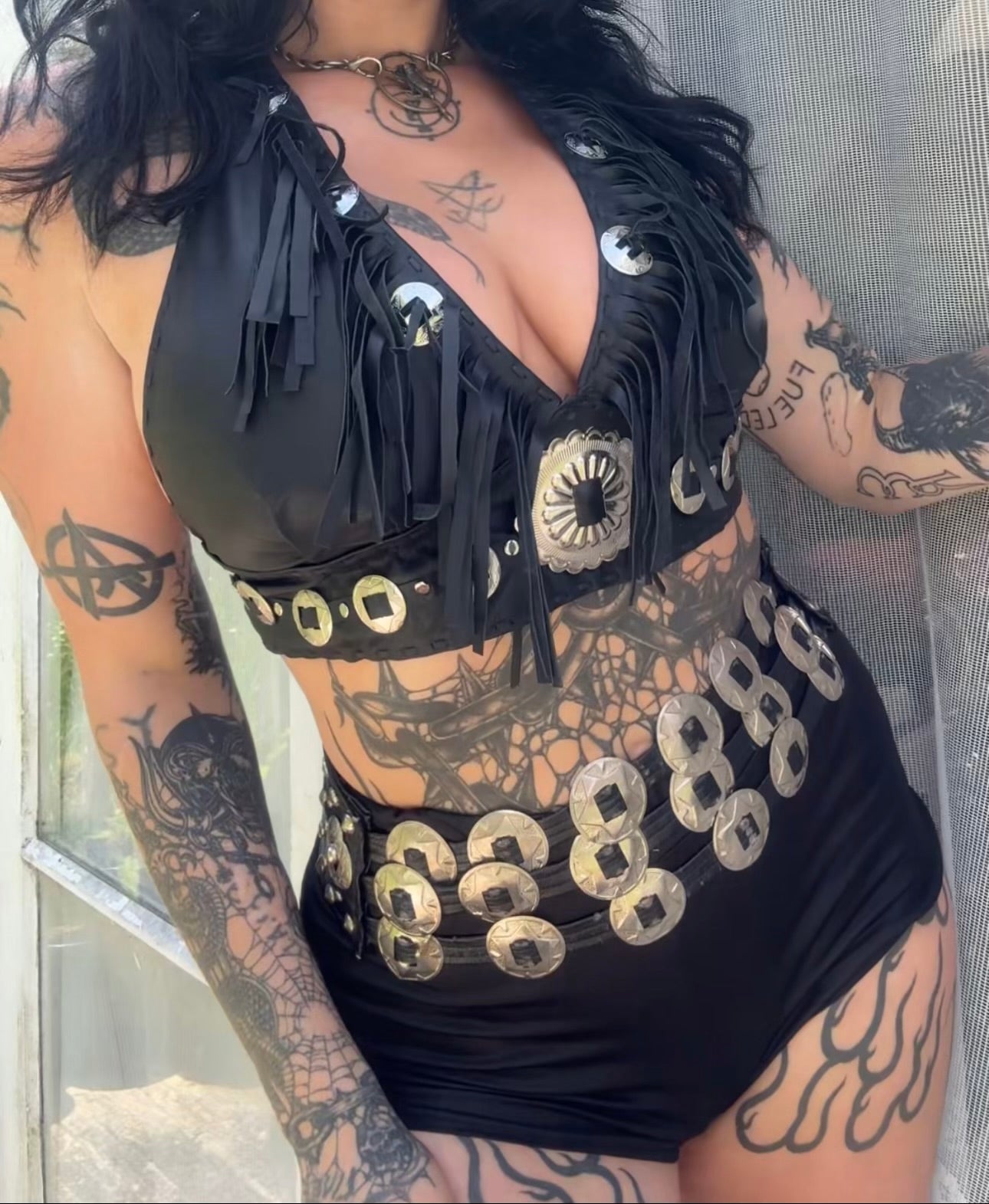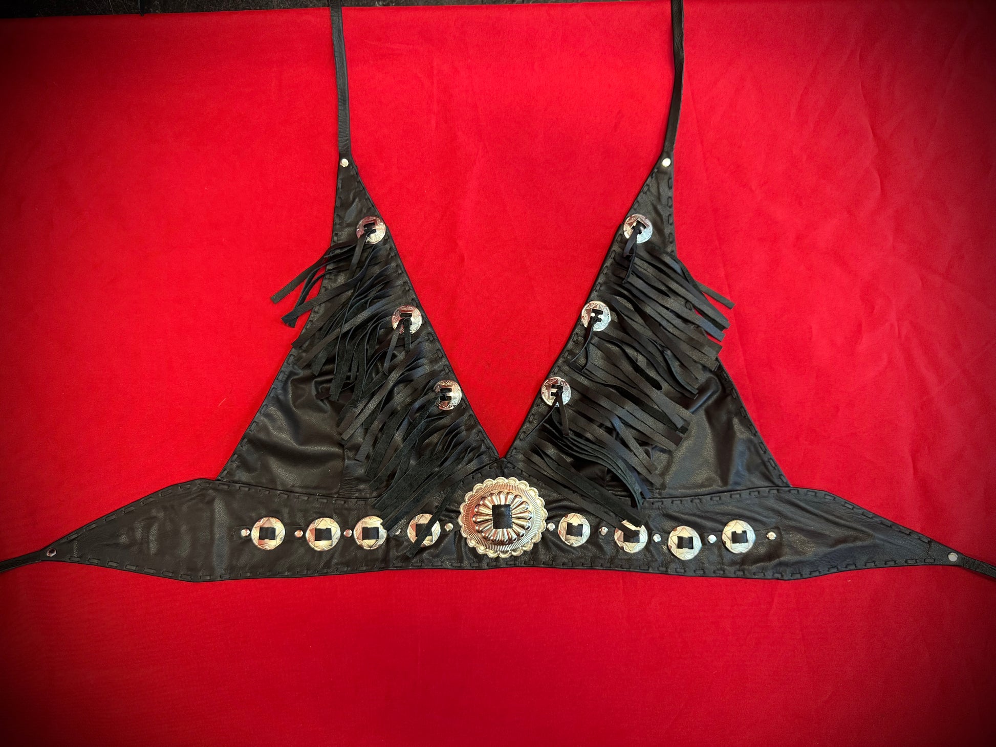 Inspired by a halter design I spied in a 70s easyrider magazine, we have the ‘La Grange’ halter. Milano cow hide leather hand stitched with leather lacing , hand cut fringe and concho embellishments on each cup, plus a concho under bust belt! Handmade leather straps tie up around the back and neck.