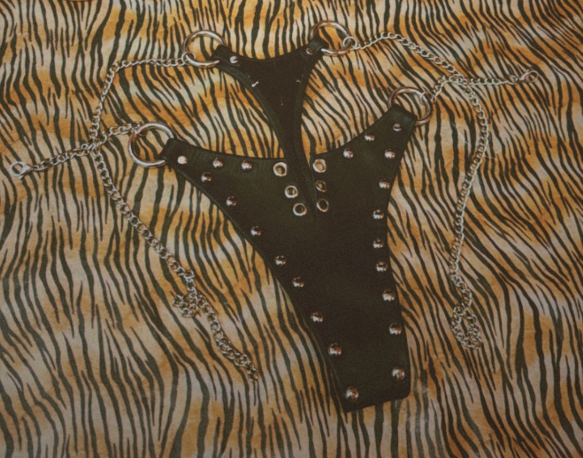 The night prowler is made from black Milano cowhide, hand stitched with leather lacing (or machine sewn), either handmade leather strapping tie up at the sides or chain & clasp. Details include heavy duty o rings, dome studs, rivets and a decorative lace up front ✨