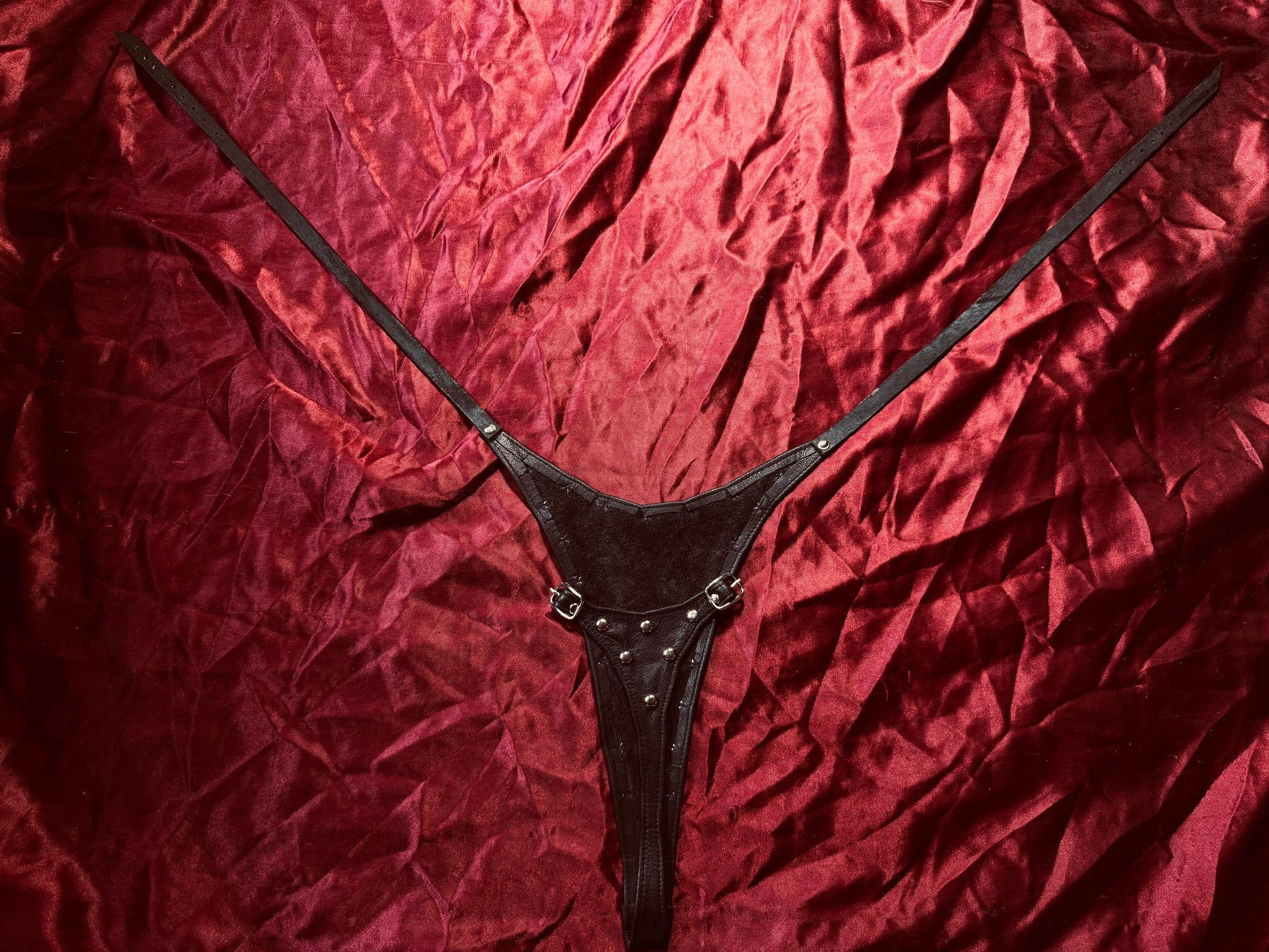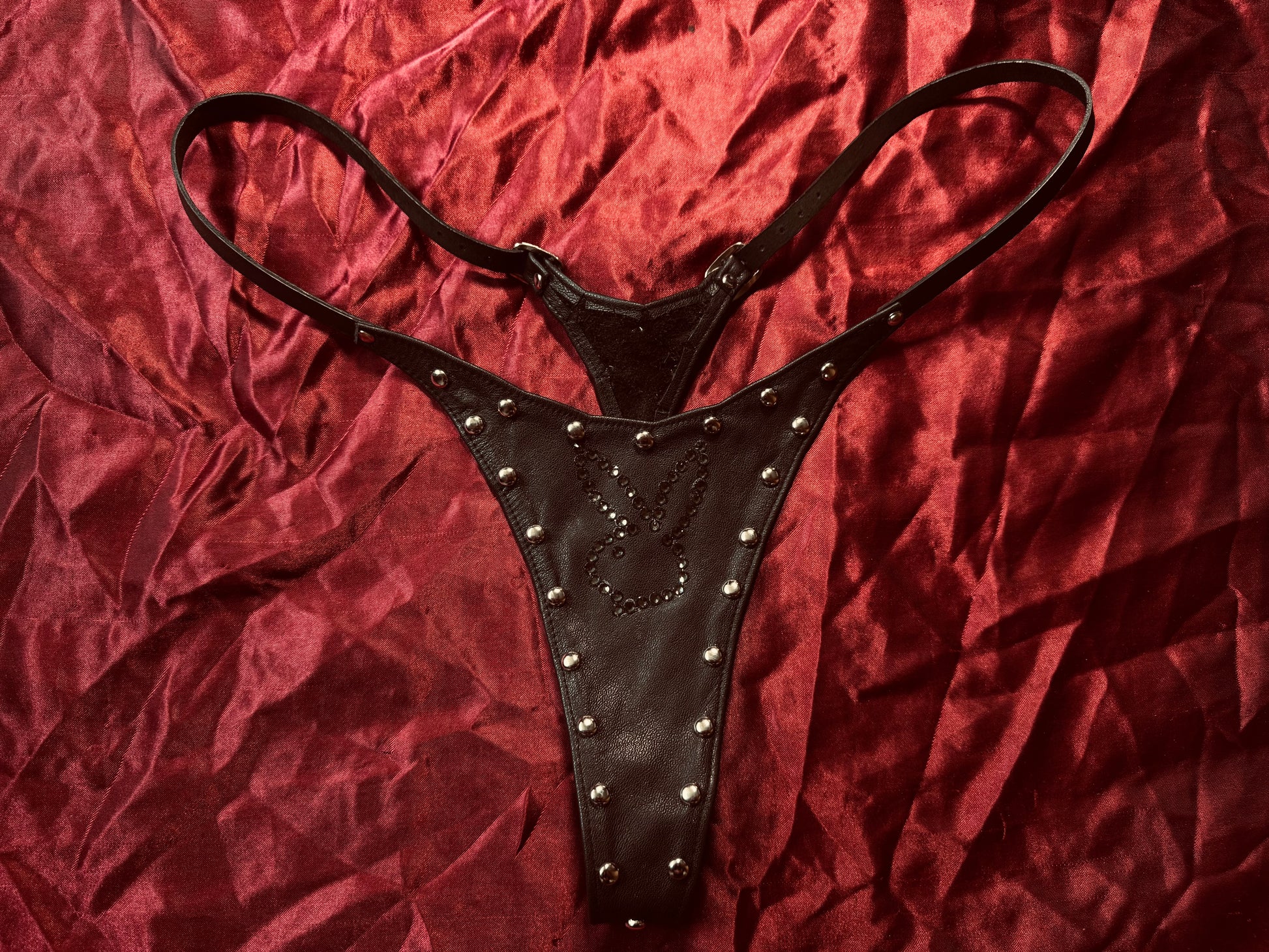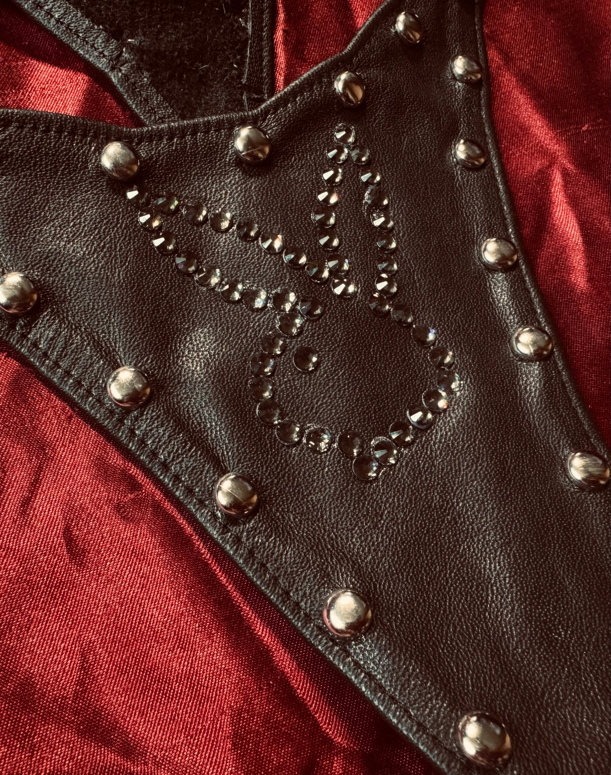 The Pam thong is made with black Milano cowhide leather with dome stud and ‘black diamond’ rhinestone bunny details. Adjustable side straps buckle at the back.
