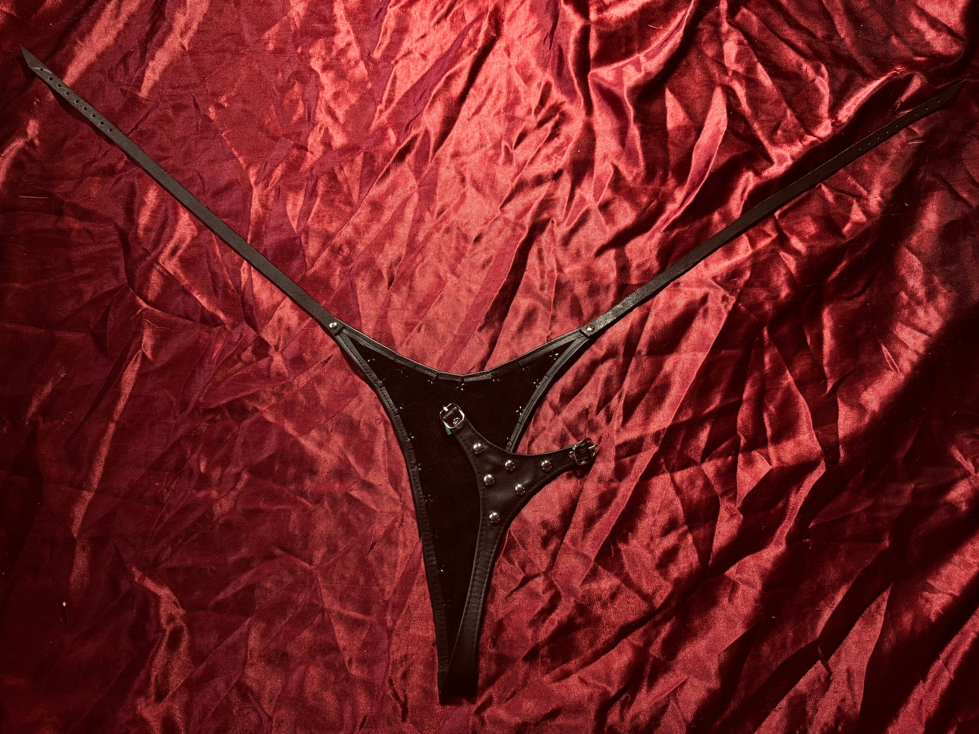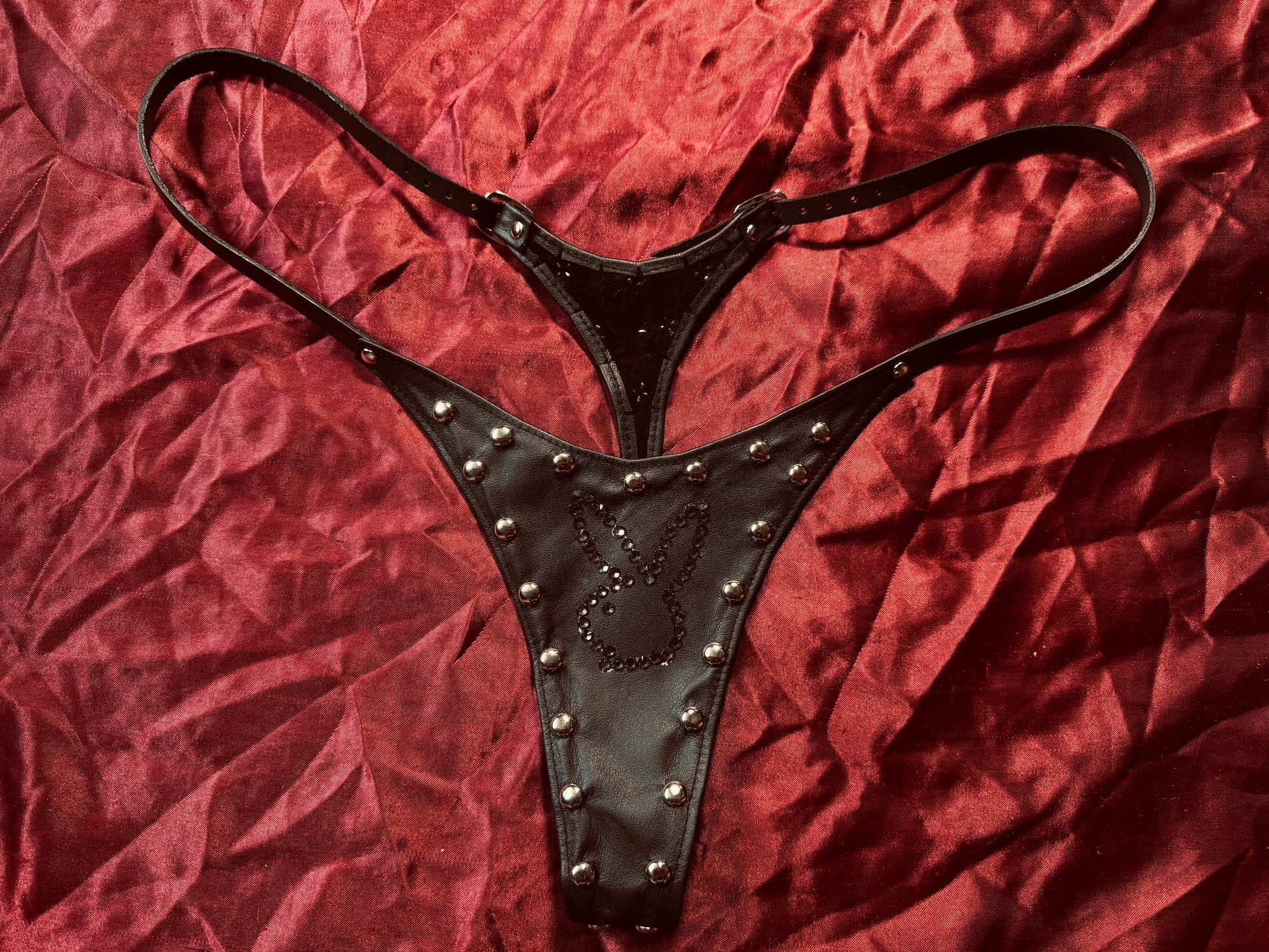 The Pam thong is made with black Milano cowhide leather with dome stud and ‘black diamond’ rhinestone bunny details. Adjustable side straps buckle at the back.