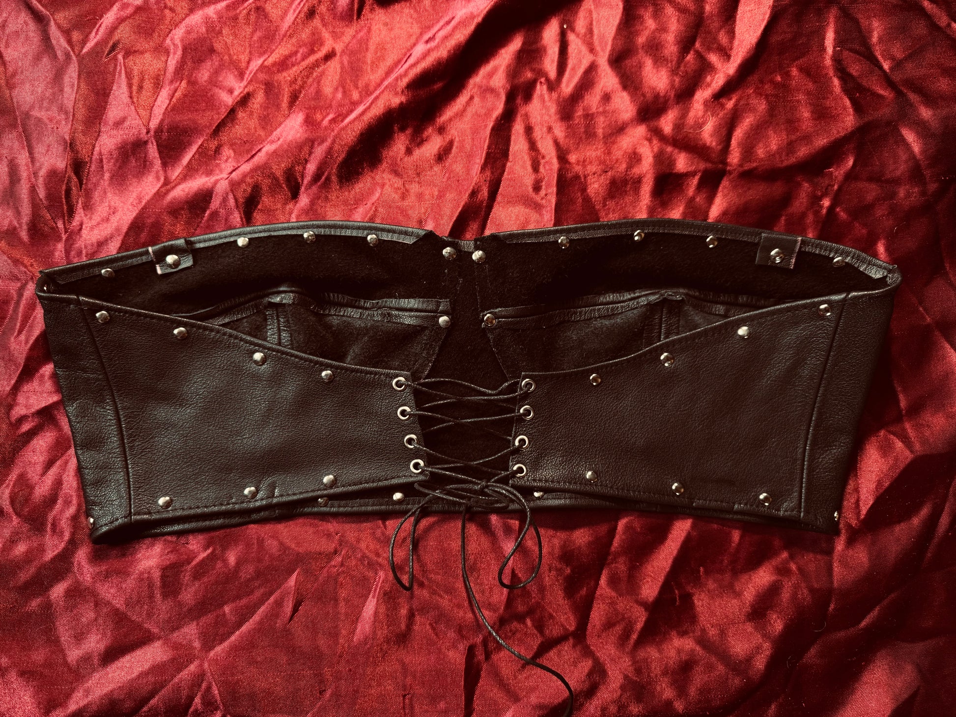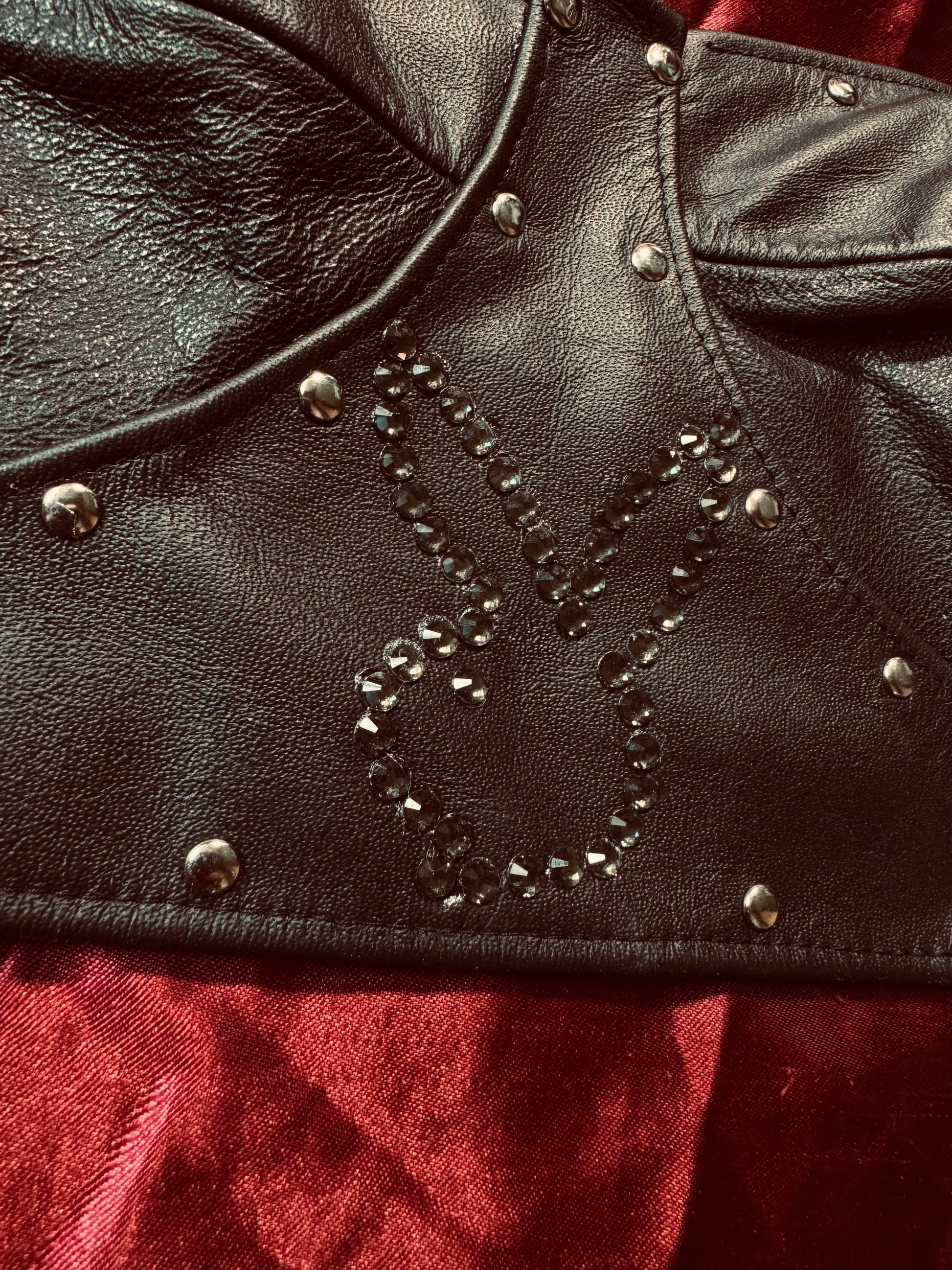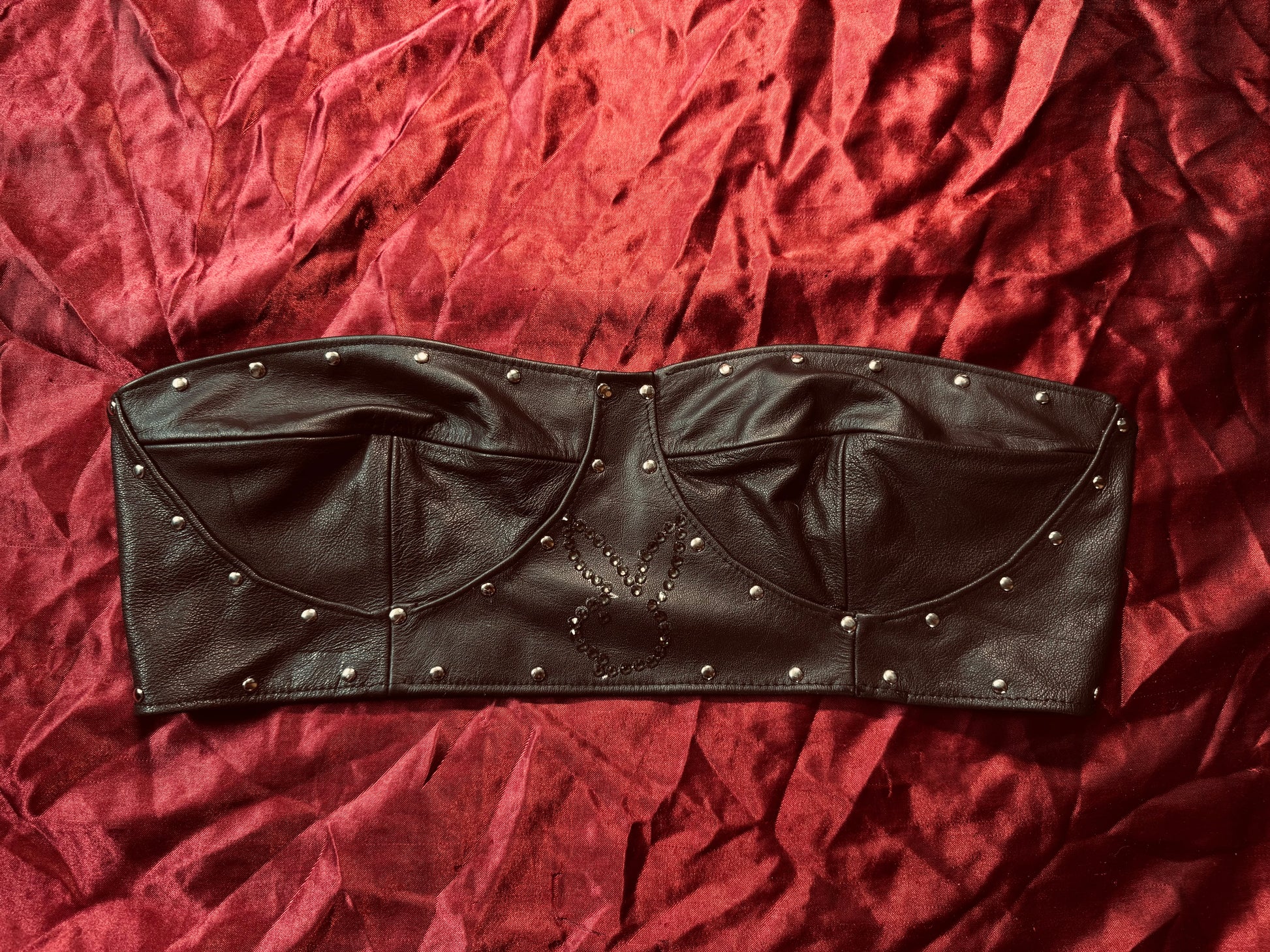 The Pam top is a balconette cup style strapless top made with black Milano cowhide leather with dome stud and ‘black diamond’ rhinestone bunny details. Lace up back closure through eyelets. Comes with ‘invisible’ shoulder straps you can put on and off.