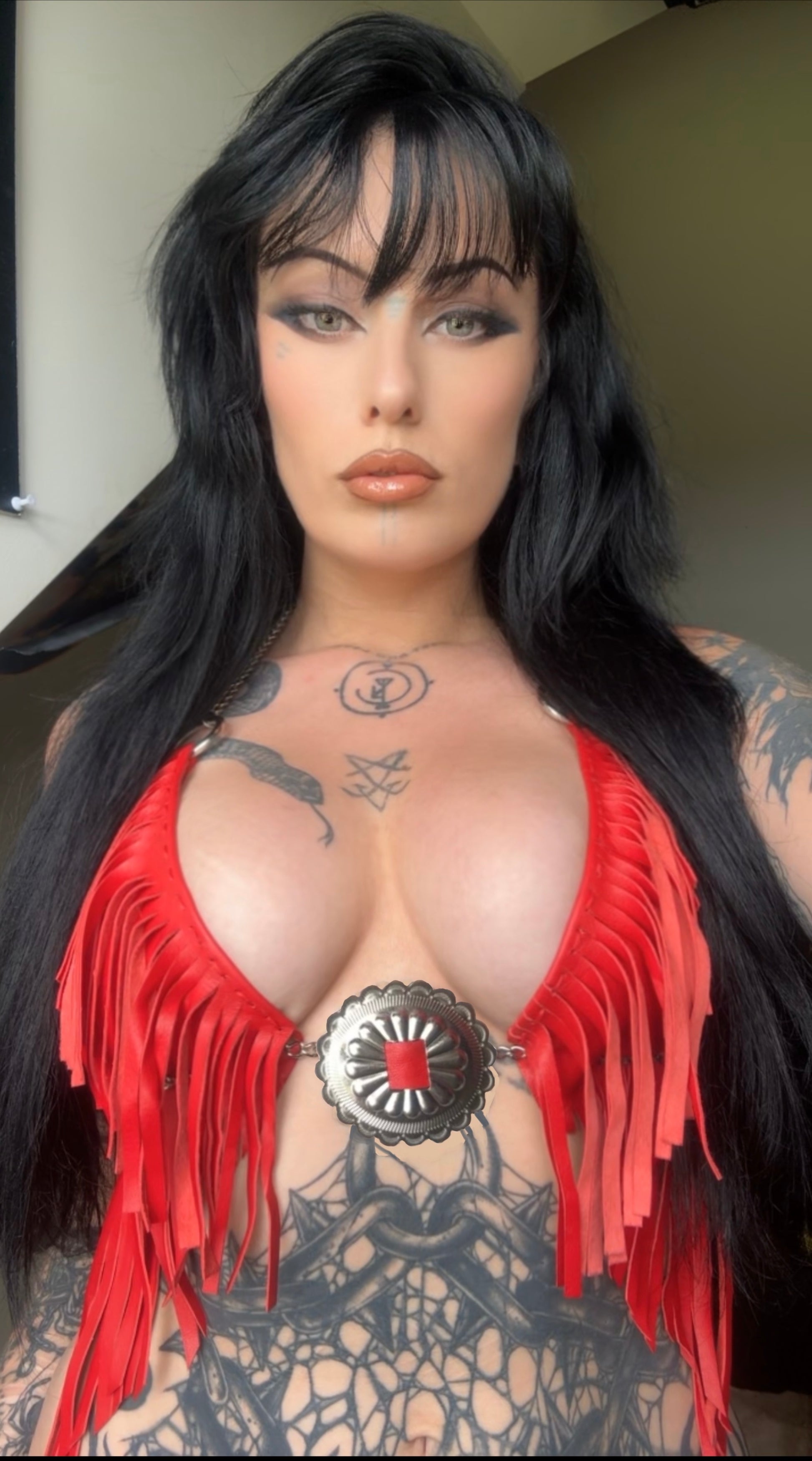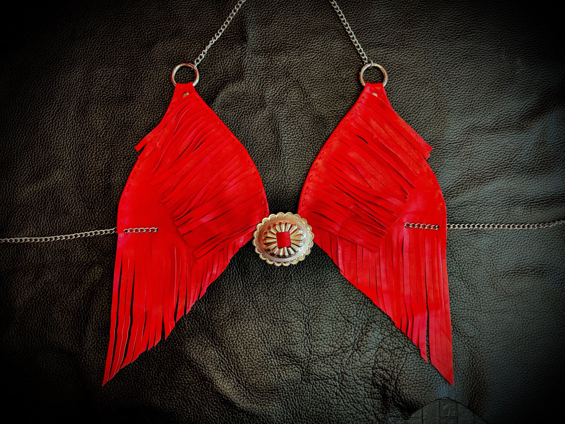 This halter top is made from soft red kid nappa leather, hand stitched with waxed cord lacing. Double hand cut fringe, large silver concho, heavy duty silver o rings, and silver chain with a clasp to close around the back & back of neck.